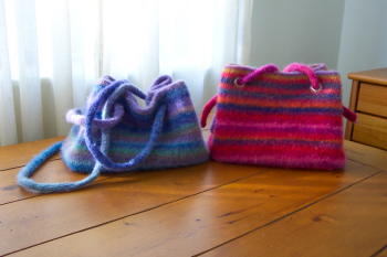 The Boogas are not the same size - proof, if you need it, of the truth spoken in "Felted Knits" - the same yarn may felt differently in different colors. I think the lighter colored blue-lavender bag felted down smaller because it took longer to felt at all. Just a theory. Also note that the red and orange bag has grommets. Am I grommet-tool-impaired, or does that damn thing just not work? I resorted to a hammer to install my grommets because no matter how I squeezed, it didn't pinch the things together enough to hold them in place. Maybe it's the thickness of the yarn, or maybe if you want grommets, buy the grommets and a hammer, skip the gadget. The grommets do give a nice finished look, but they're a pain.