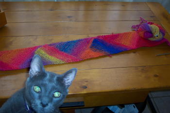 and the re-knitted Kureyon scarf for girlchild, with the bit of acid green/yellow in these skeins, and a hammy cat getting into the picture: