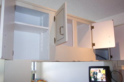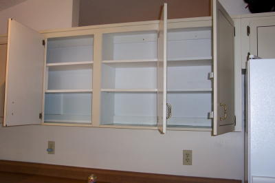 But not as unhappy as she was when big burly John Goodman-esque cabinet man (husband of tall, very muscular and tanned cabinet lady, who joined him later) came to start the job. She was still on her perch over the fridge, and now she was trapped, cornered by a Big Stranger with Power Tools. I couldn't coax her down and she stayed there until they fired up the saw to cut the cabinets apart. That got her moving, and she climbed through the cut-through at the ceiling to the top of the computer cabinet in the living room. I stood on my chair and lifted her down, and she bolted for my bedroom to join the boys under the bed. All three cats spent the rest of the ripping-out hours under my bed with very buggy eyes. Sending them to the vet's for the install is definitely the way to go here. They hated this.