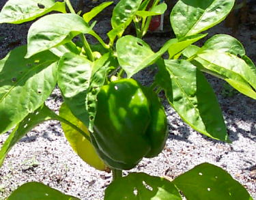 This plant reminds me of Charlie Brown's Christmas Tree - it's maybe a foot and a half high and has been nibbled by insects, but it's putting out enormous green bell peppers. It's comical.