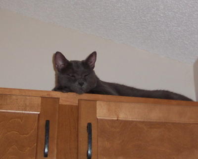 It's nice to know the new cabinets have received the Boris Seal of Approval. He has found his way to the favorite napping spot near the ceiling over the fridge. I'm a little concerned about him jumping up and down before the countertop is in place but there's not much I can do to stop him. Cats are like that. I just hope he tries to be dainty about it.