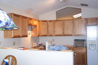 It's much uglier in person (check out the bath towel stuffed into the ceiling vent and the electrical tape covering holes in the wall) but I love the cabinets even without crown molding and hardware, and I'm on track (knocking wood) for countertop template and lighting selection this weekend. Maybe in