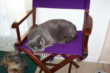 I had planned to move my computer back into my office this weekend - the big cabinet is just not right for me. I turned it into a rat's nest of forgotten papers - I need to have my bills and important papers neatly organized in plain view, or I'll forget they exist. So cleaned my office, put the patio furniture in the garage (someday there will be a patio, I just have to believe...) moved the computer back, and then looked around the space. Neat, clean, and beige. Cream and tan and white and wood and iron furniture - I'm a minimalist but this was a little too blah even for me. Off to Pier One. (Public service shopping alert, they are having a great sale, especially on their wonderful candles!) I used to have a side chair in my office before it was broken by a relative who shall remain nameless who was a bit too, er, voluptuous for it. So I replaced that long-missing chair with a purple chair with beads and a large gray cat: